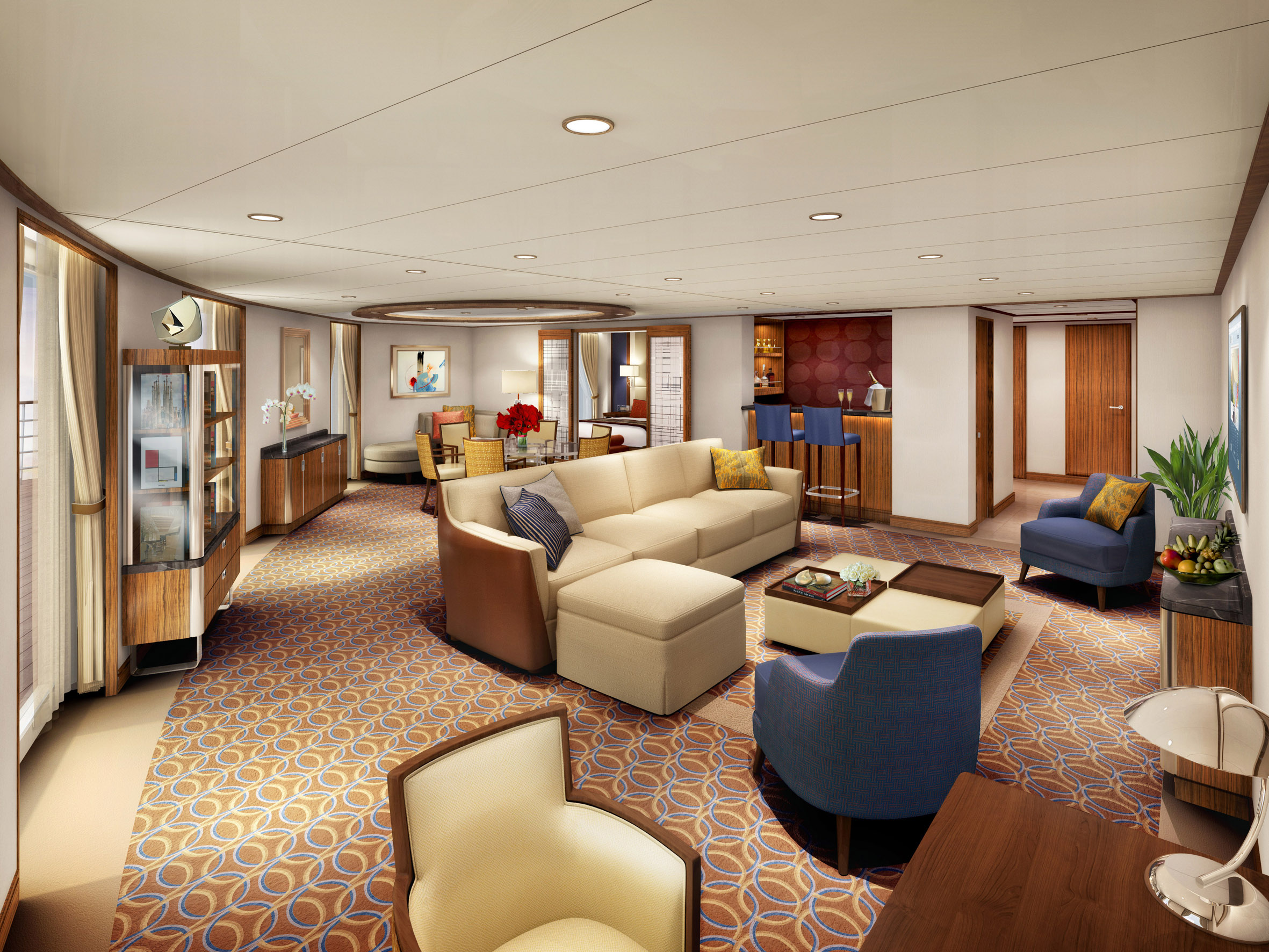The suites were designed by hospitality icon Adam D. Tihany and blend modern design elements and innovations consistent with Seabourn’s reputation for understated elegance. Drawing inspiration from the line’s rich history and yachting heritage, the suites will evoke a residential atmosphere with high-level furniture and rich mahogany wood.