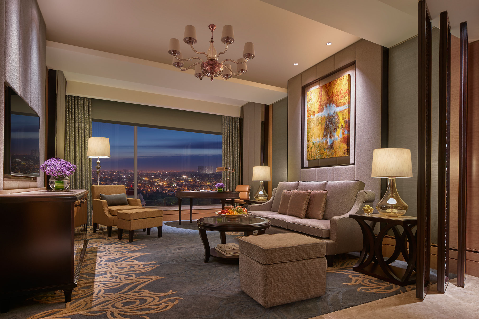 Guestrooms start from 41sqm, and each features an executive desk, plush patterned carpeting and free Internet access. Outfitted in locally sourced New Gold Vein marble, the bathrooms are spacious and built-in with a wardrobe, bathtub, separate walk-in rain shower and antique bronze mirrors.