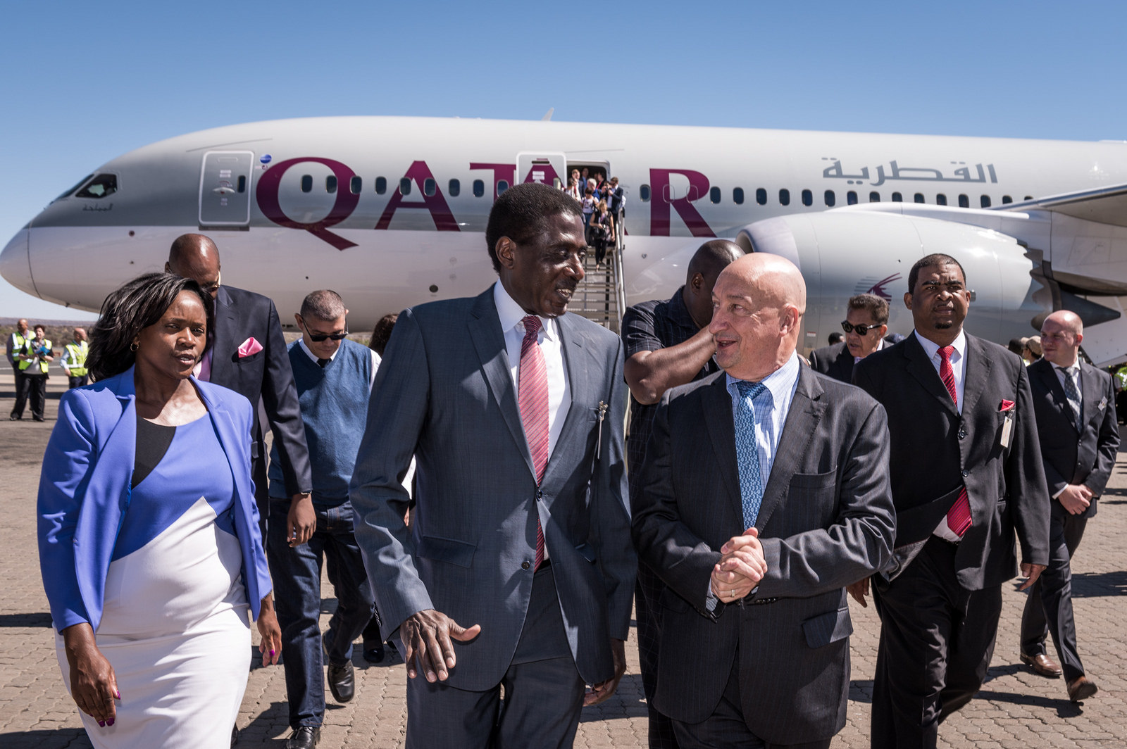 A VIP delegation from Doha, including Qatar Airways Chief Commercial Officer, Dr. Hugh Dunleavy and Namibia’s Ambassador to Qatar, His Excellency Mr. Japhet Isaack, was greeted at the aircraft by Mr. Digu Naobeb, Chief Executive Officer, Namibia Tourism Board and Qatar’s Ambassador to South Africa, His Excellency Mr. Salem Abdullah Sultan Al Jaber.