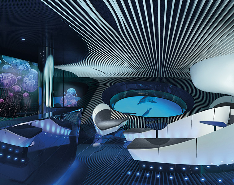 An immersive sound experience can be felt in the Body Listening sofas, which discreetly vibrate in unison while offering unique sensory listening through corporal resonance. This global listening through the entire body, in harmony with the ocean’s natural cycles, will bring guests closer to the marine mammals they might see and hear behind the giant portholes.