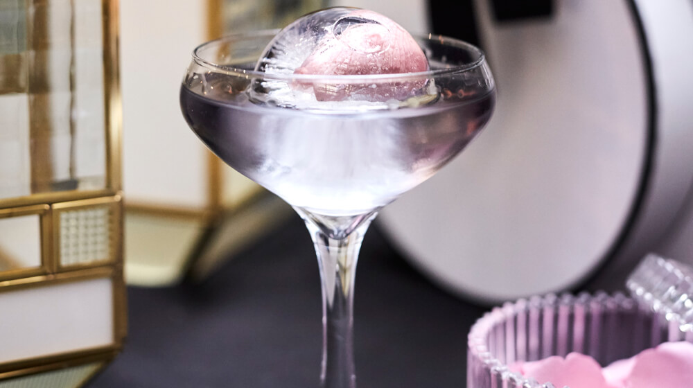 The Flower cocktail – Grey Goose Le Citron, Lillet Blanc, Crème de Violette and rosewater-infused ice sphere with a frozen pink rose.