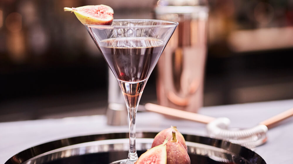 The Line cocktail- Spiced Rum, Pedro Ximenez and Mozart Dark, garnished with fresh fig.