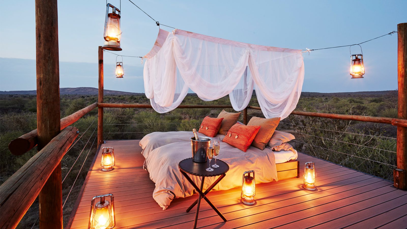 Guests may indulge in a special experience by spending a night falling asleep surrounded only by flickering lanterns while listening to a lullaby of roaring lions, crying jackals and laughing hyenas in the Star View Sleep-Out Hide. The rustic double-storey structure is tucked away in a secluded part of the lodge’s grounds overlooking a waterhole, making it the perfect retreat for romantics with a sense of adventure at heart.