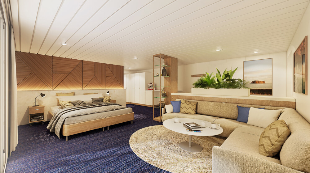 The Navigator lounge invites passengers into the bridge and provides a fascinating, rare vantage point of ship operations. The ship also includes two Bridge Deck Balcony Suites (the Cairns and Darwin suites), with outside-facing bathtubs and a spacious lounge area.