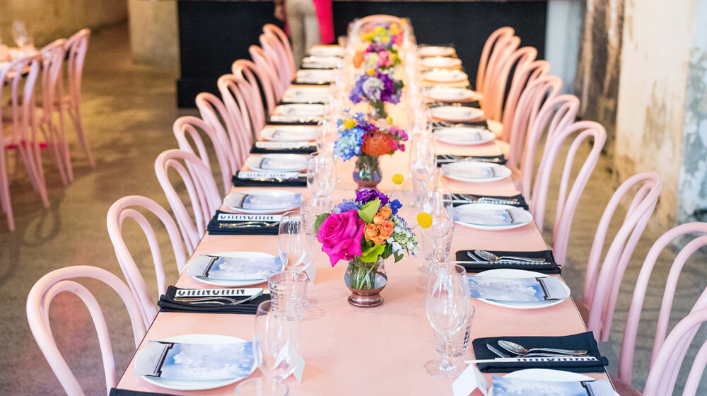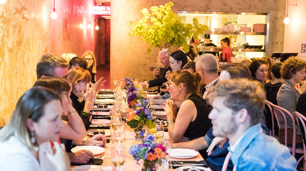 Guests were greeted with the Chin Chin Pink Flamingo Signature Cocktail, a vodka-based confection with yuzu, grapefruit and lemongrass. Two long tables were laden with platters of Pan-Asian delights for sharing. Entrees included kingfish sashimi, corn and coriander fritters, betel leaf and spanner crab, and delectable Chin Chin pork ‘roll ups’, while mains of butter chicken curry, squid and green mango salad, twice-cooked beef short rib, Balinese roast duck, stir-fried green beans and mushroom rendang left guests planning their return to the restaurant.