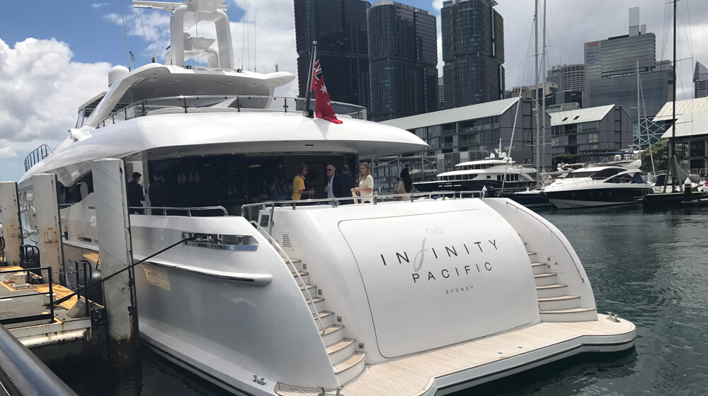 Infinity Pacific is docked at The Foreshore, Sydney’s Superyacht Marina at Rozelle and is now available for charter for multi-day itineraries, events and even private dining expereinces.