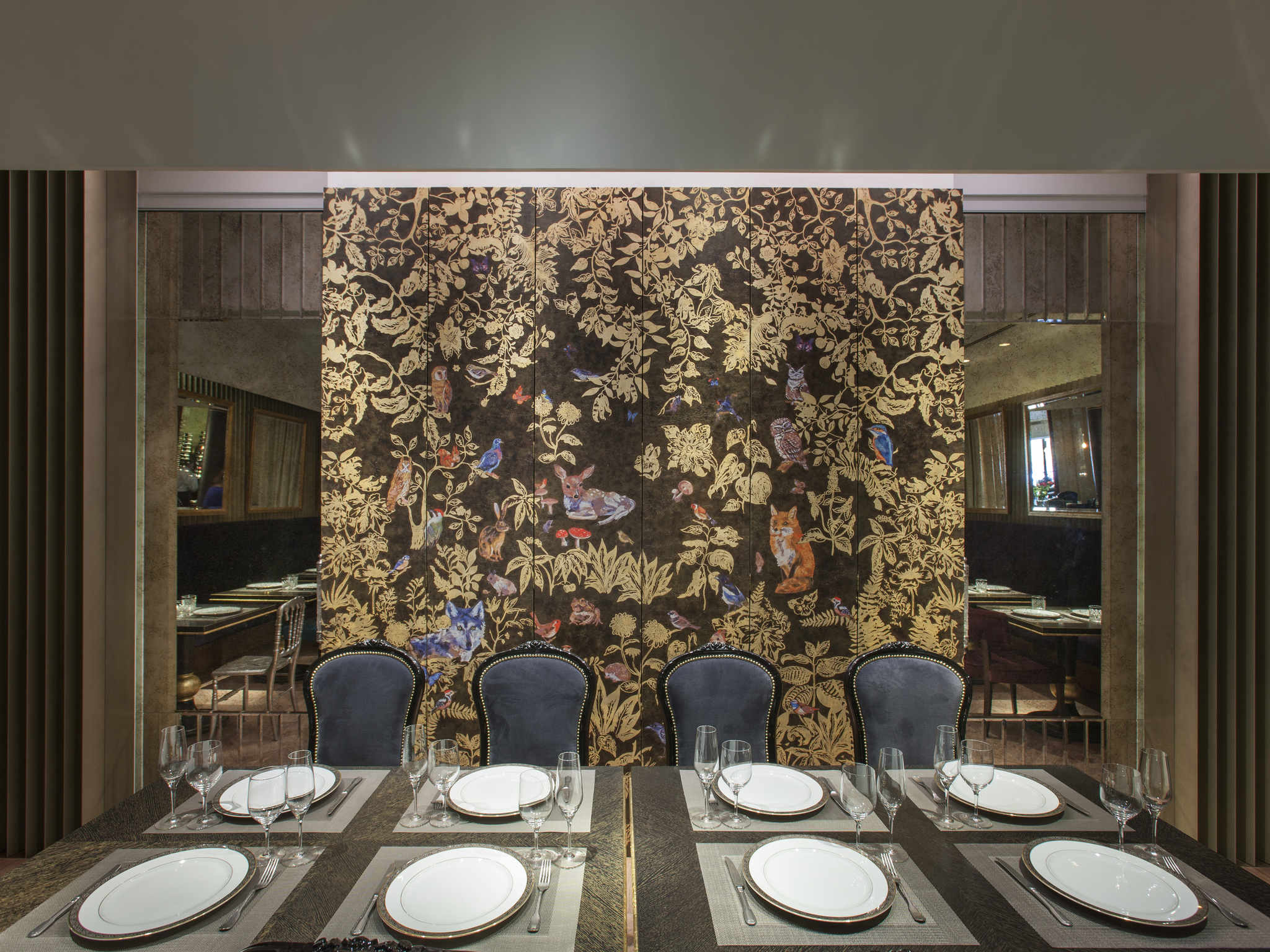 Antonio Citterio drew on the Fabergé Eggs for his inspiration. These enigmatic jewellery masterpieces come to life in the hotel’s interiors in a modern interpretation. The Ortenzia Very Very Gold lighting designs are crafted from 24-carat gold, while the frozen acrylic installation by artist Jacopo Foggini, has fine details that lend the appearance of a casket of jewels.
