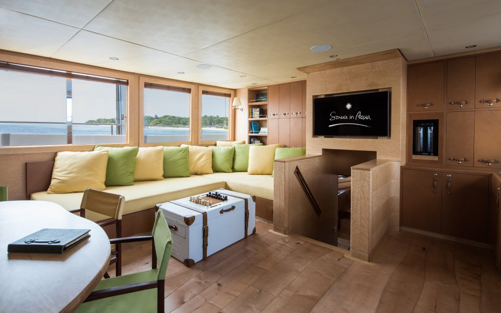 The two-cabin yacht features a spacious main cabin with a glass bottom spa and shower facilities. The second cabin offers a king-sized bed and en-suite facilities. Other features include an external raised sun and dining deck, a lower level bar and dining area plus daybeds, lounge seating and a bow Jacuzzi. Additional sun deck space is also available on a lower level for wellness treatments and an internal library, main saloon and dining room provide additional areas ideal for entertaining. The design features natural materials such as rich brown leathers, woods and organic cottons, and the engines have been built to the highest specification with regards to fuel saving efficiency.