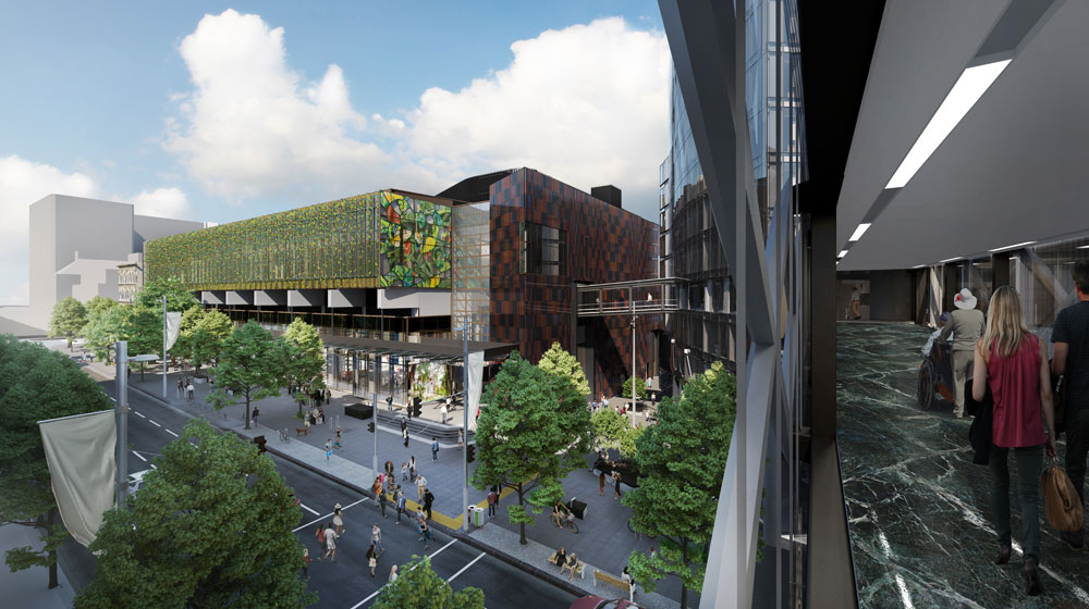 The artworks comprise 2,400 square metres of multicoloured glass over 550 panels that wrap around the top level of the NZICC and 13,500 terracotta tiles that form a spine wall alongside the retail and dining laneway beside the new centre. Installation of the glass panels will begin later this year, while the terracotta tiles will be installed from mid-2019.