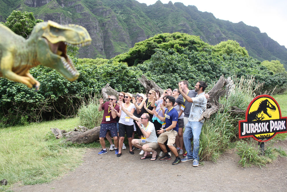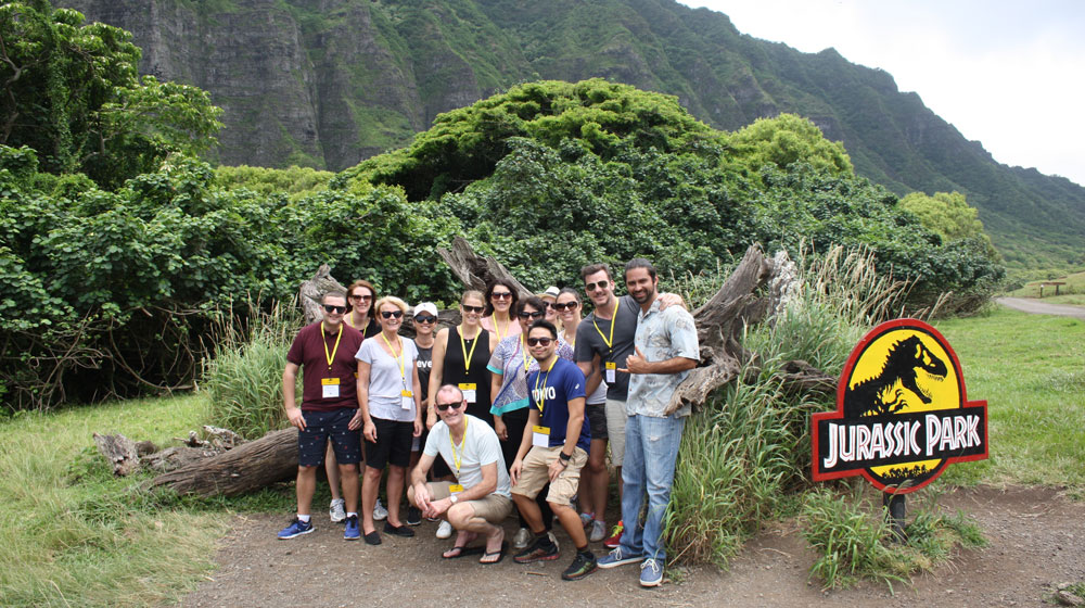 Lead image – the group are pictured at the Kualoa Ranch Private Nature Reserve in front of the world’s most famous log, which featured in the original Jurassic Park film.