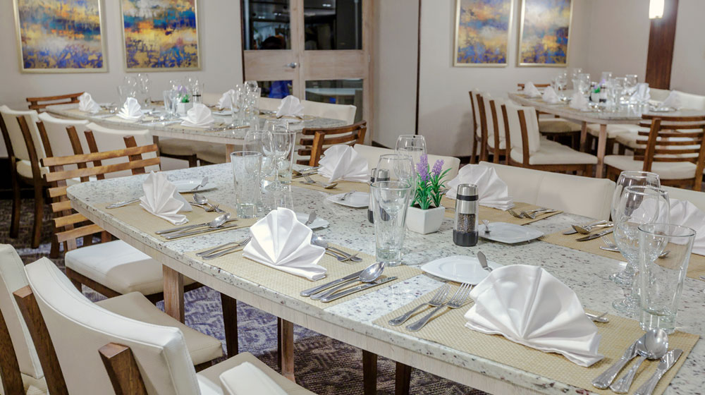 Indoor dining is elegant and cozy. We try to do outdoor dining as much as possible, but beware when you are dining outdoors in the Galapagos. You will have interruptions. There’s a lot going on. You will drop your knife and fork and you’ll be off with your camera in a flash because a pod of orcas are swimming past.