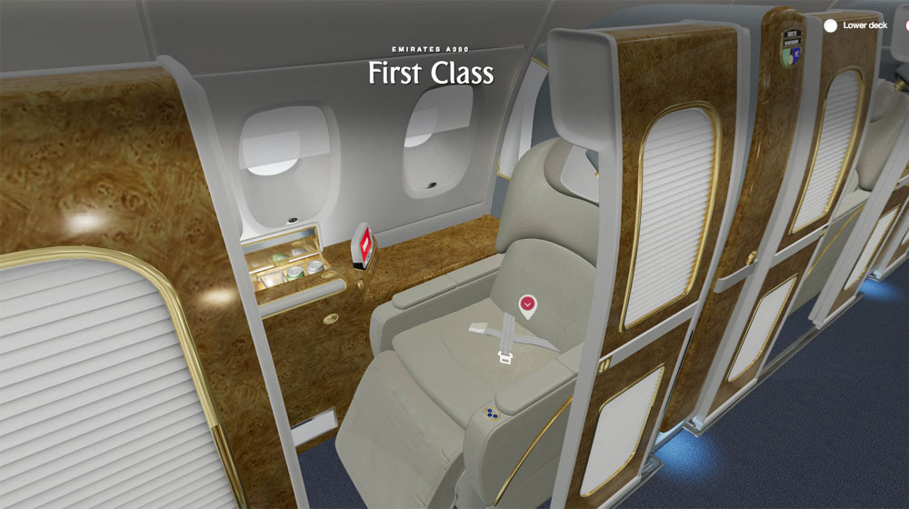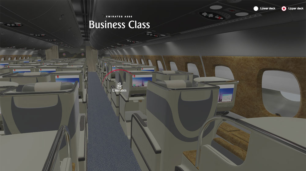 The 3D seat model is a visualisation engine that displays an immersive 3D 360-degree view of the interior of the Emirates A380 (upper and lower decks) and the Emirates Boeing 777, giving customers a chance to explore their seats, the spacious cabin and the Emirates on-board product.