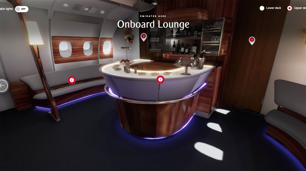 This new feature allows users to navigate through all classes of cabin, including Business and First Class, as well as the On-board Lounge and Shower Spa on the Emirates A380 using navigational hotspots.