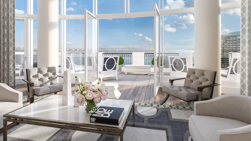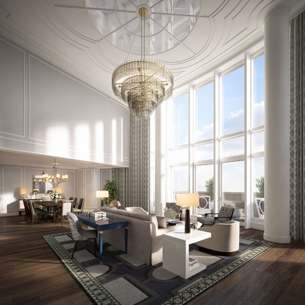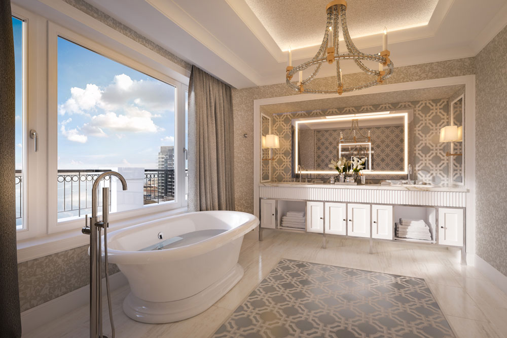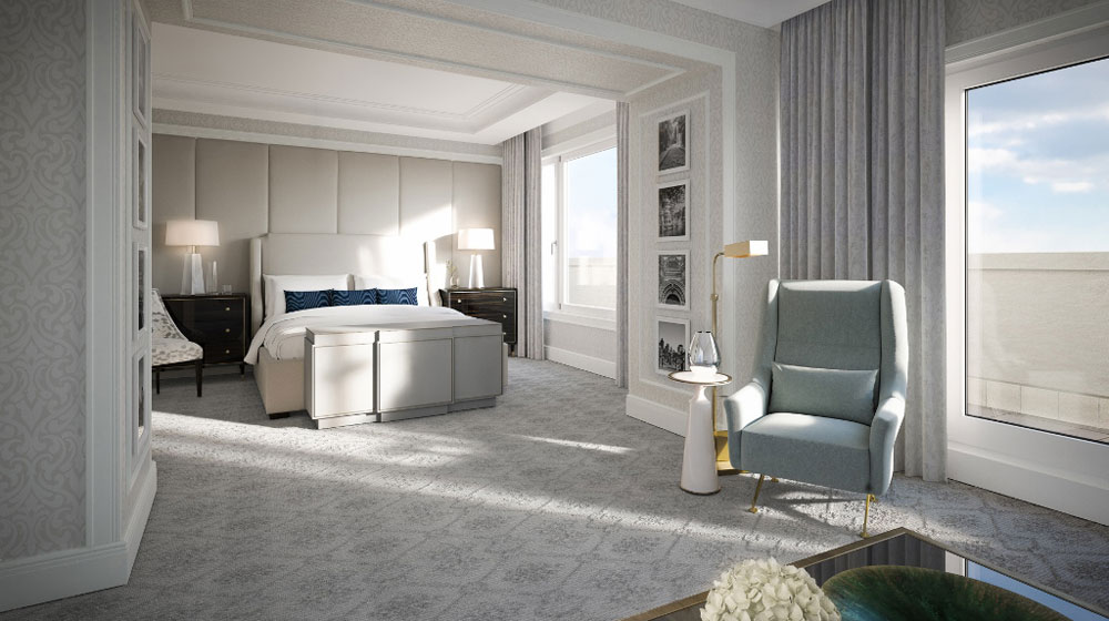 It is a bold and stunningly successful venture. Right inside a top cupola, the ninth floor suite has been created out of events space. Look up, through a bathroom ceiling window, into the cupola – from outside, you see both cupola and a hint of the Presidential. Another interesting feature is that the former solid stone wall around the suite’s 84-square-metre balcony has been dramatically cut, in almost-medieval crenellated style, to allow suite guests to have a view. Renderings from designer Rosie Feinberg of SFA Smith Firestone Associates already give a hint of the elegance, of the overall silver-grey hue. Even hard back books, say on Dior, add to the colour scheme.