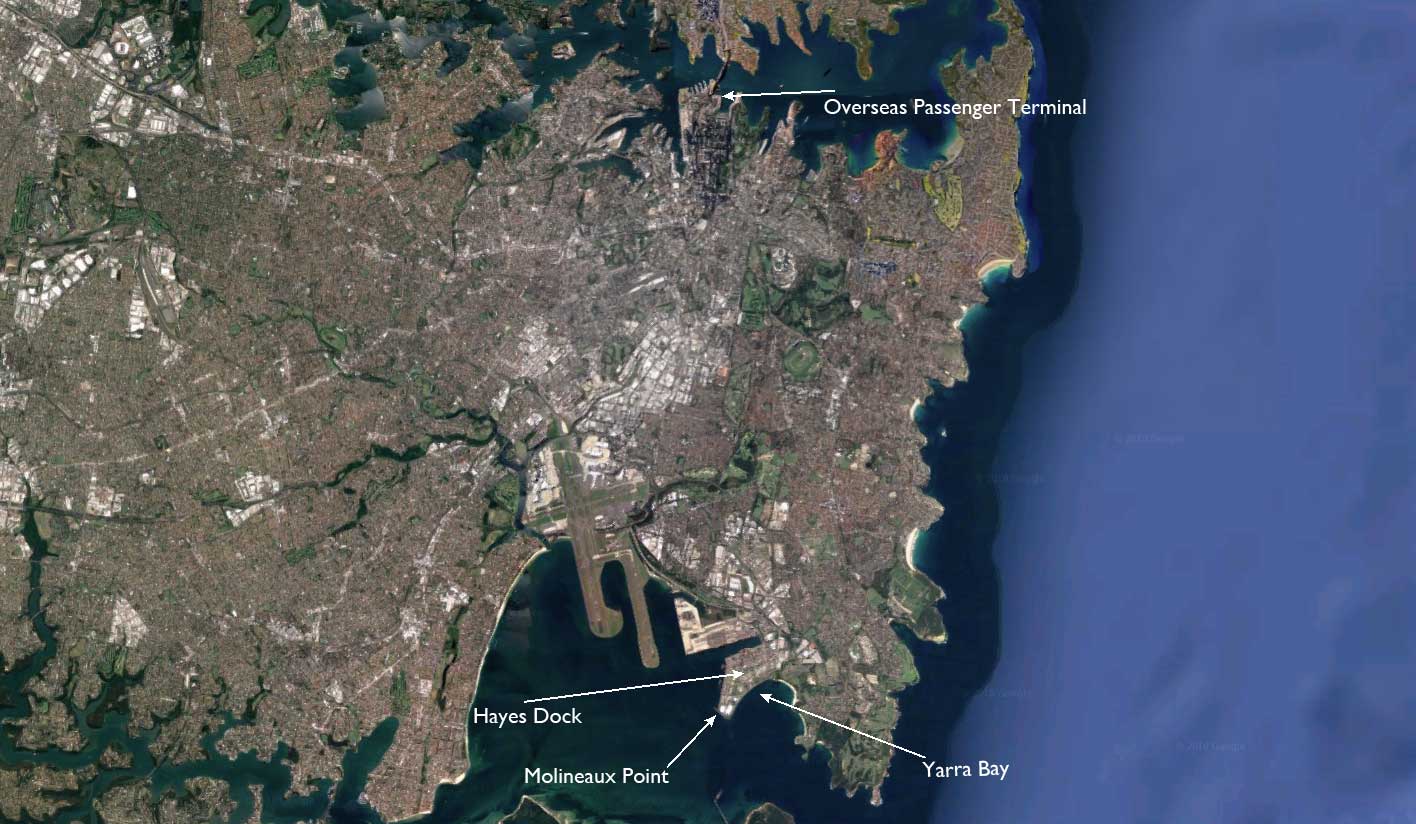 Hayes Dock is a container wharf that is positioned parallel to the third runway of Sydney Airport – about 15 kilometres south of the Sydney Opera House, instead of a 15-minute walk from the Overseas Passenger Terminal at Circular Quay. There are two sites at Hayes Dock which may be viable sites: Molineaux Point and Yarra Bay.