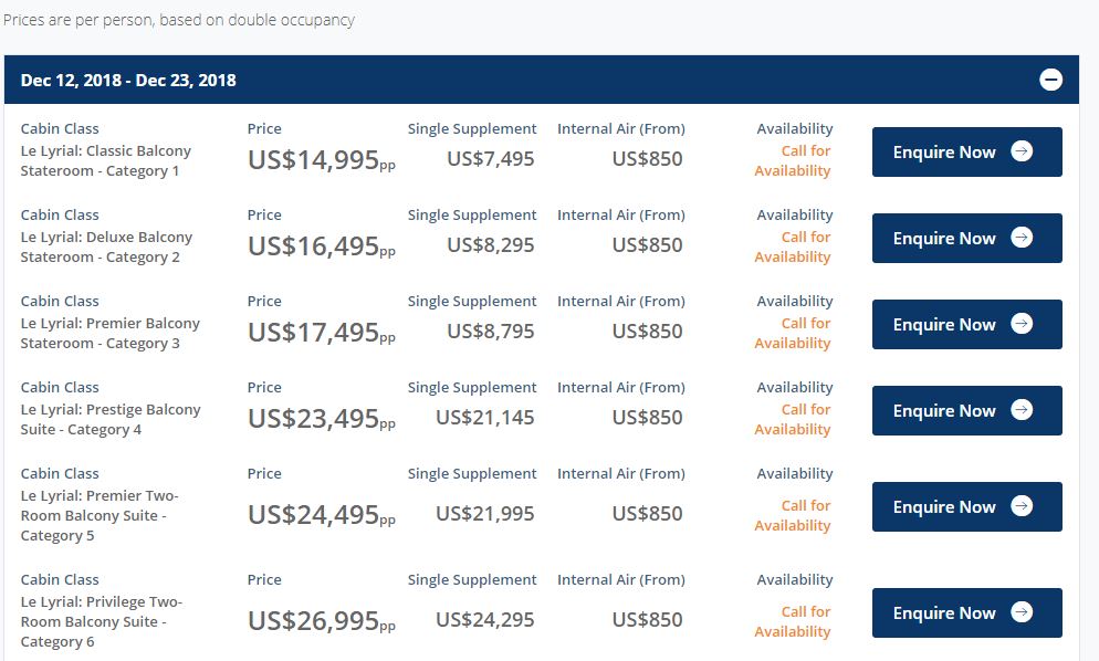 Prices are listed below, but subject to availability at time of booking. Enquire for pricing for higher categories.