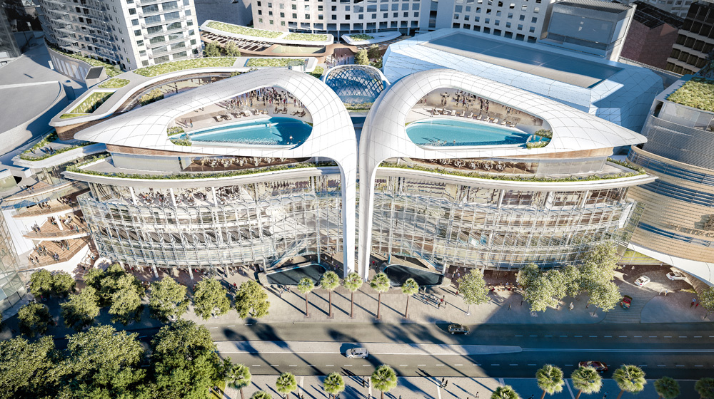 View of the proposed ribbon development (including pools) above the existing façade – Concept image only, subject to all approvals.