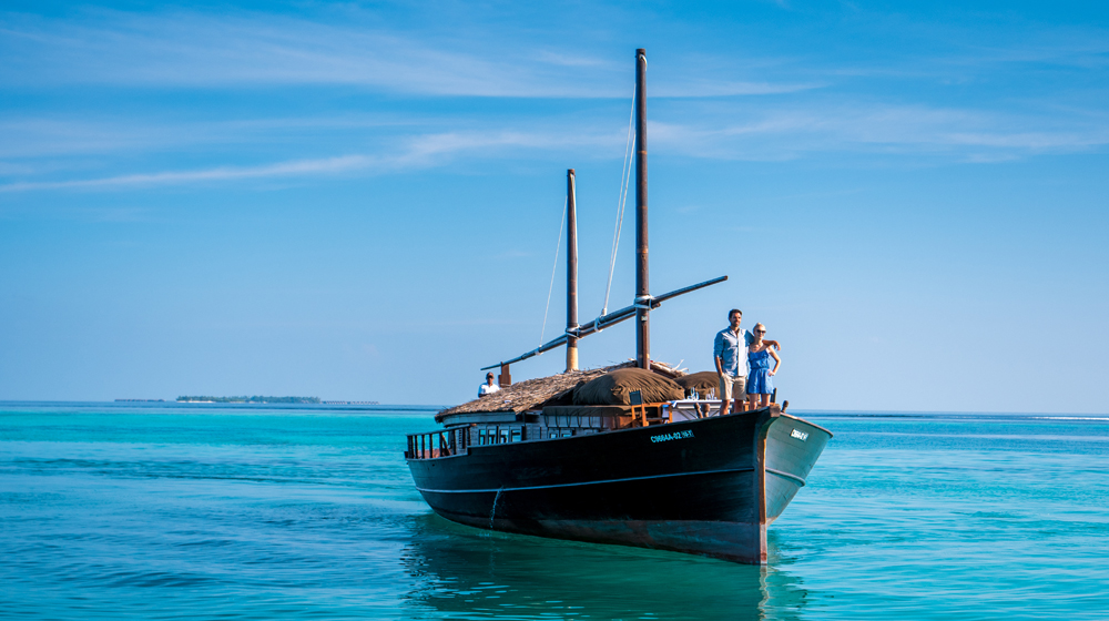 Explorers drawn by the enveloping blue expanses of sea and sky can now heed the call of the ocean at FLOAT: under sail on a traditional hand-crafted Maldivian dhoni or yacht; carving through the waves aboard Veloce, a dashing 45-foot Italian cocktail of air-conditioned elegance and speed; dancing across the glittering swell by kayak, parasail, catamaran or board.