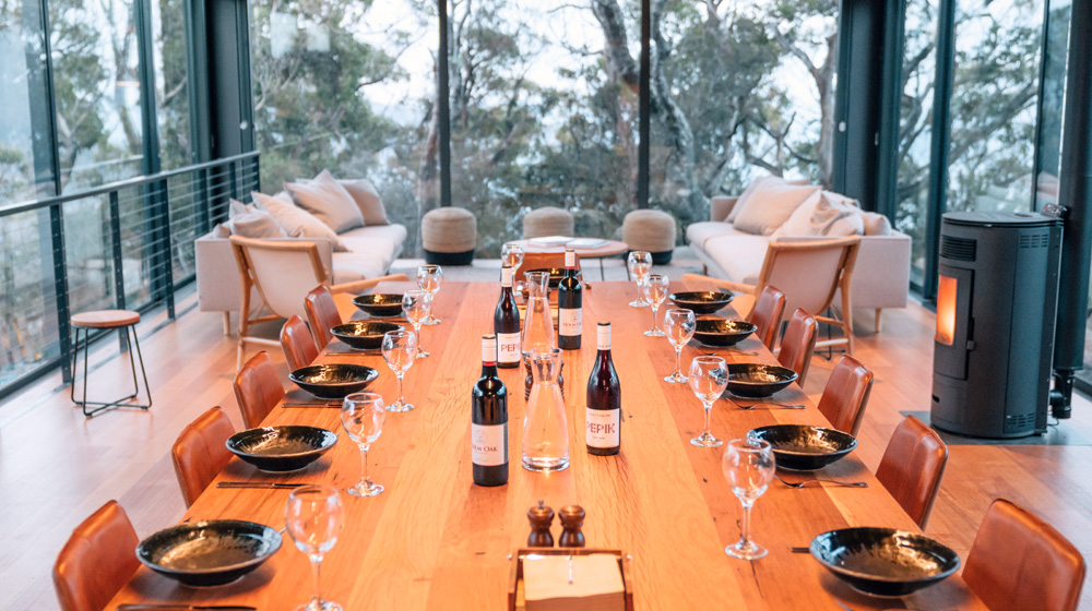 Three Capes Lodge Walk’s Crescent Lodge and Cape Pillar Lodge offer unrivalled and dramatic views of the Tasman National Park in every direction. Providing the perfect fusion of sustainable living, creature comforts and contemporary design, the lodge draws inspiration from the rich cultural offerings of the region. Large sliding doors in the living and communal spaces invite the outdoors in, with simple earth-toned furnishings and natural exposed timber joinery made from trees removed during construction. The lodges feature seven double/optional twin rooms with floor-to-ceiling windows to continue the immersive experience.