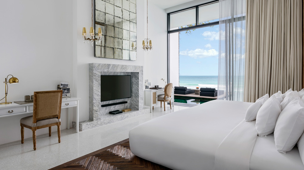 This 359-square-metre pool villa stands as a singular bold statement of a well-travelled working creative. Key features include absolute beach frontage and access, a custom-made 3.3-metre-wide bed, dedicated living and dining spaces, a library, an outdoor cinema, expansive courtyard with private gym and Jacuzzi, an upper floor terrace with spectacular views and an 8.5 x 7.5-metre-long saltwater swimming pool.
