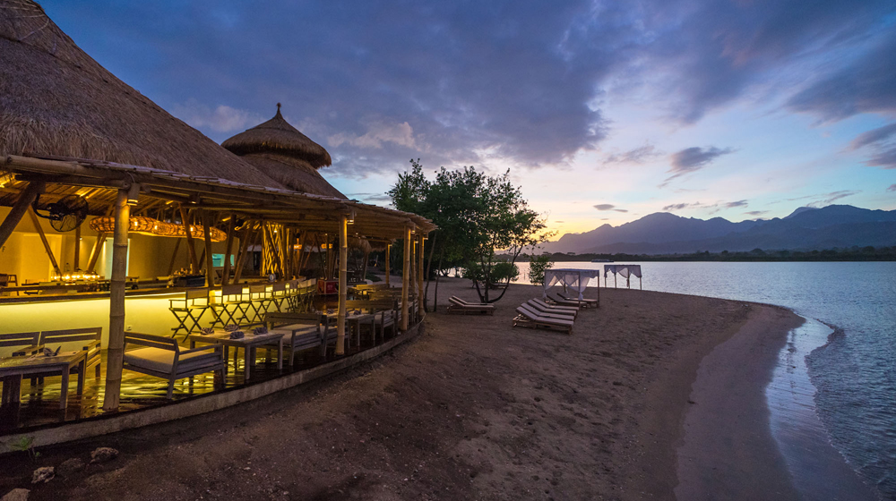 Echoing the sustainable architecture of the Resort’s impressive communal structures, the Beach Club’s restaurant & bar is housed within an open-sided bamboo edifice. Here, a striking framework of bamboo columns and beams creates an interesting play of vertical, horizontal and diagonal lines, which twist, intensify and surprise under the organic curves of the soaring ‘alang-alang’ grass roof. Furnishings also showcase the natural aesthetic beauty of bamboo, introducing hanging lanterns, bamboo chairs and blonde-wood tables with a distressed-antique finish. This simple rustic style has been carefully chosen to ensure that nothing detracts from the spectacular vista of mountains, mangroves, the gentle waters of the bay and Pasir Putih ‘white sand’ Beach.