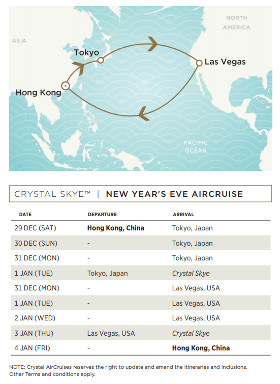 “We are excited to announce our new itinerary for Crystal Skye’s New Year Double Countdown Celebration,” said Thatcher Brown, President of Dream Cruises & Managing Director of Crystal Cruises Asia. “With the success of our sold-out inaugural New Year AirCruise to Sydney and Hawaii last year, we were encouraged by the response of our guests to create a brand-new journey taking in the diverse splendours of Tokyo and Las Vegas while ensconced in our luxurious private jet and cared for by our staff of dedicated Crystal attendants.”