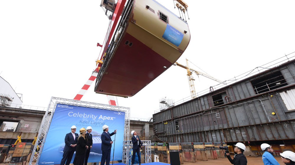 During the ceremonial keel laying of Celebrity Apex at the Chantiers de l’Atlantique shipyard, a 762-tonne block was lifted in the air and a lucky coin was placed on the dock before the block was lowered into position.
