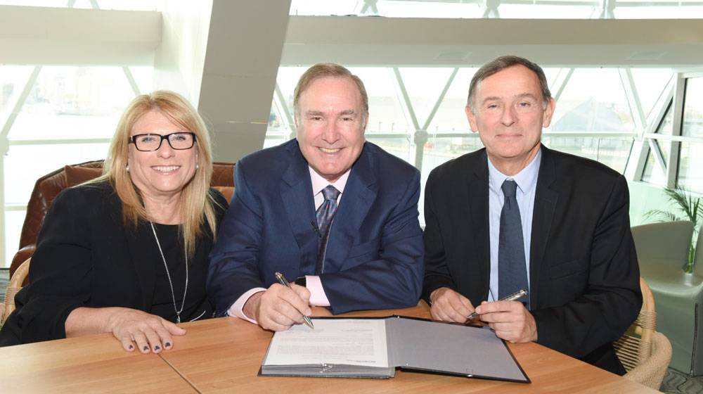 Prior to the historic delivery ceremony for Celebrity Edge, Celebrity Cruises President and CEO Lisa Lutoff-Perlo, Royal Caribbean Cruises Ltd. Chairman and CEO Richard D. Fain (centre), and Chantiers de l’Atlantique General Manager Laurent Castaing gathered in Eden to sign over ownership of Celebrity Edge to the brand.