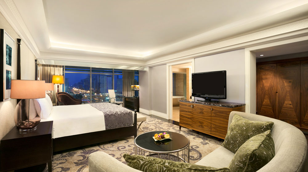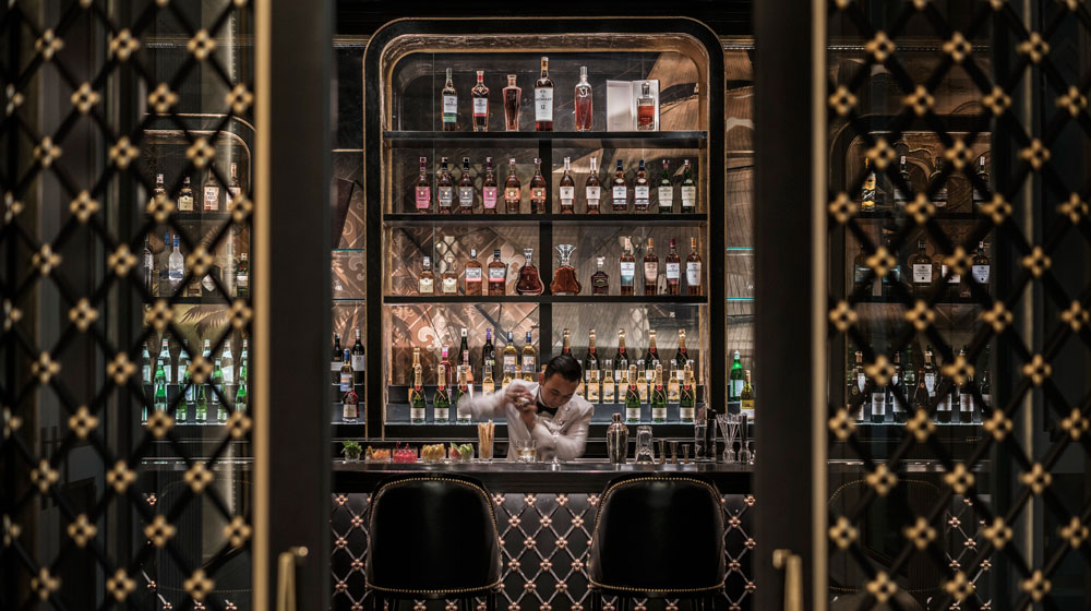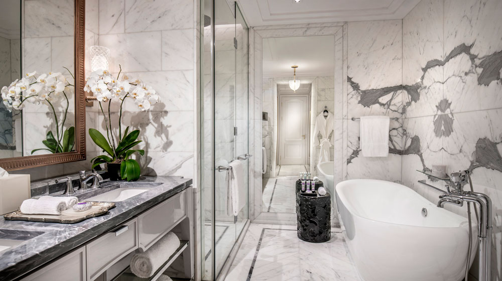 Champalimaud’s talent includes an almost unmatched eye for colour. All 125 units here are suites, from 63 square metres up. Suite 1609 is best described as a subtle silver-grey palette, which includes full-height panels of modern chinoiserie, delicate chrysanthemums on a shiny silver background.