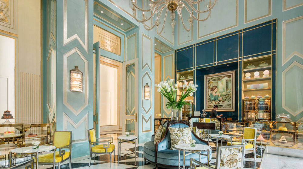 Oh that salon, another venue of exquisite beauty, with mustard chairs in front of displays of cake boxes in soft gelato colours, pistachio and rose. High above is yet another crystal chandelier, and as I walked out I noticed a bough-shaped chocolate confection on which playing cards are affixed. This is an absolutely gorgeous hotel, with endless touch points, many of them delightfully whimsical.