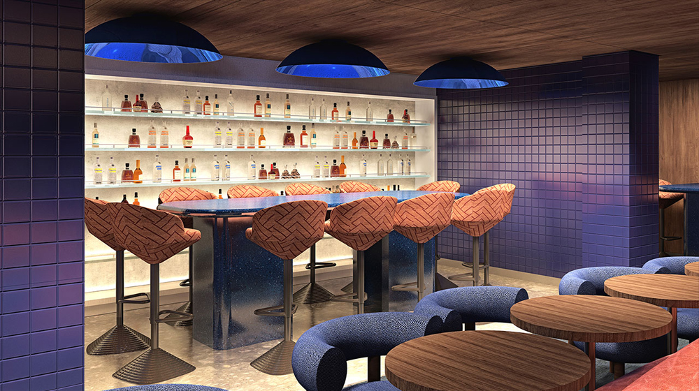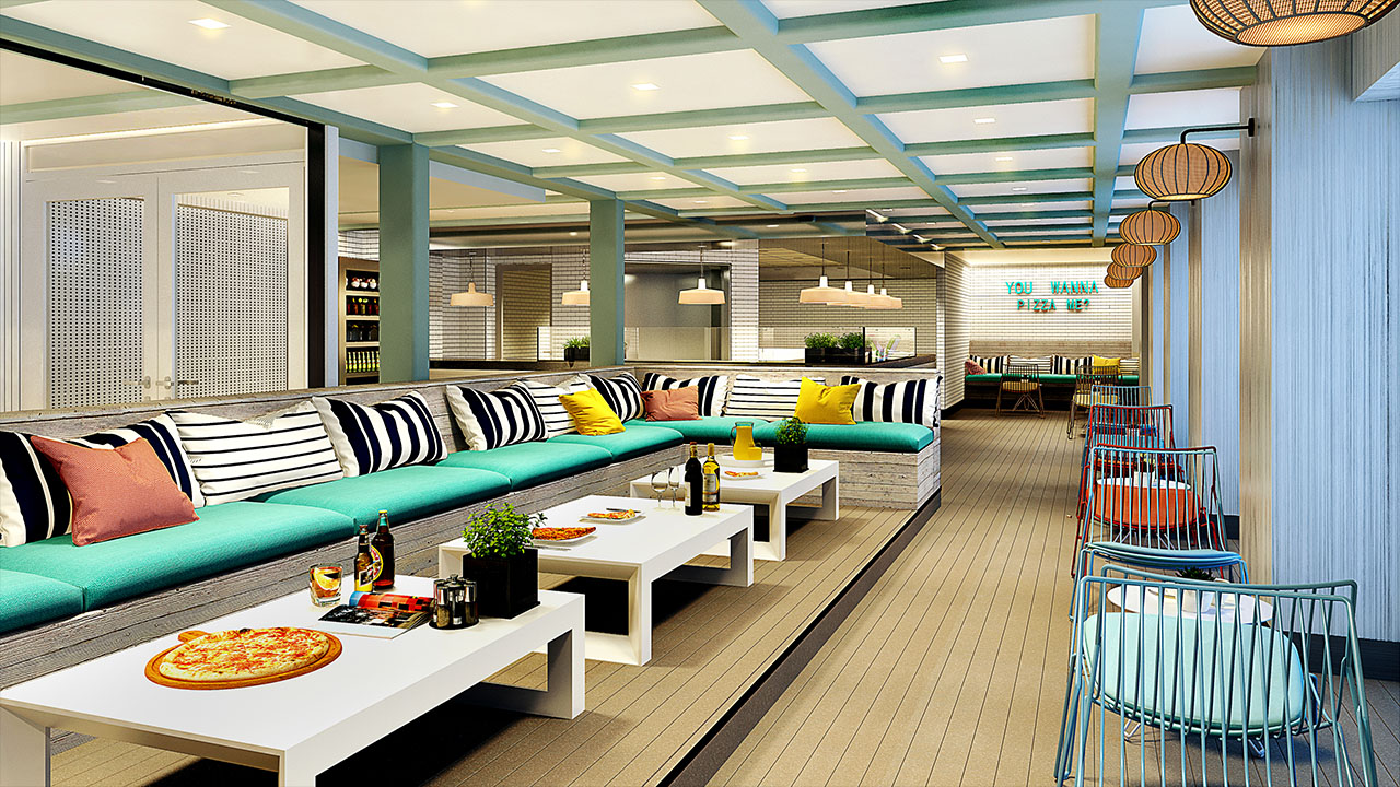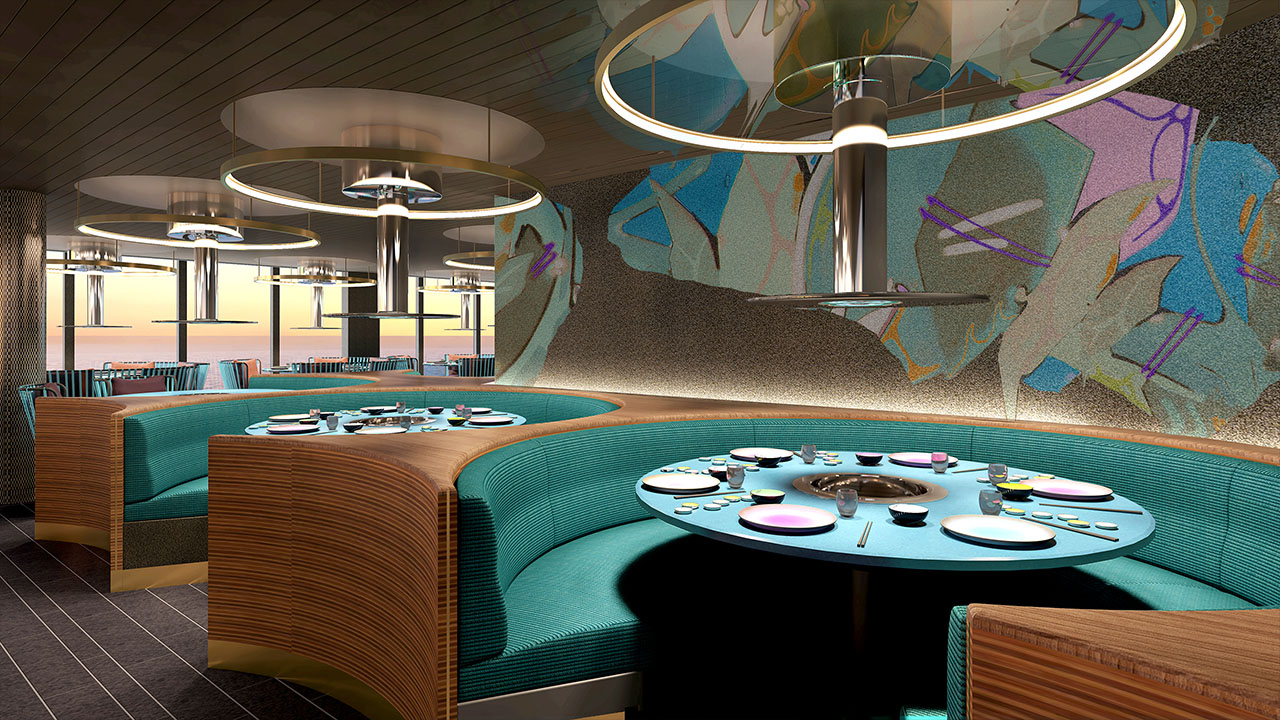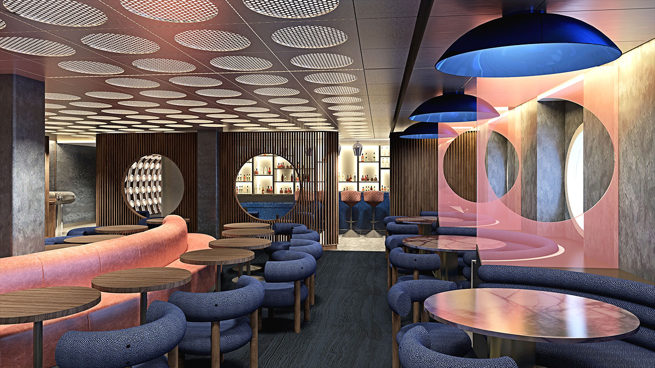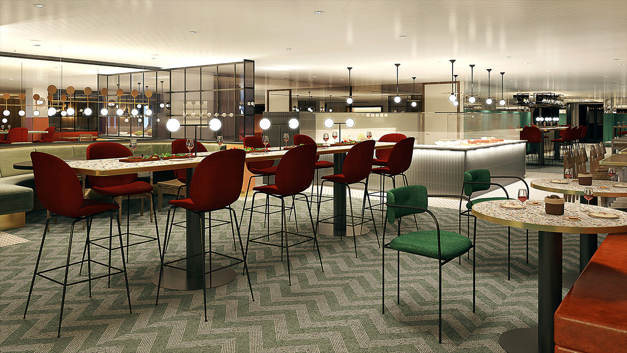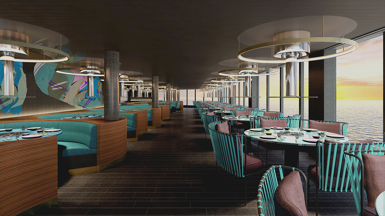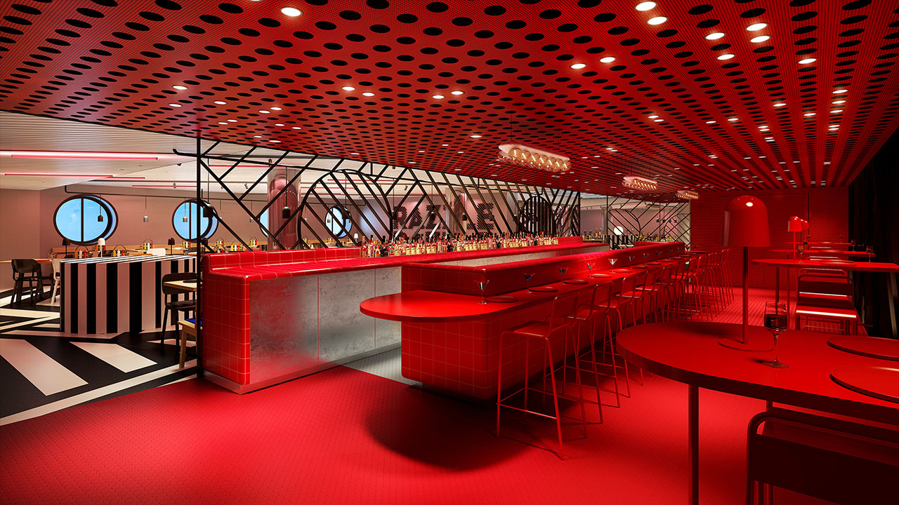Razzle Dazzle will be Scarlet Lady‘s signature onboard eatery. Its bold design is designed by Concrete Amsterdam.