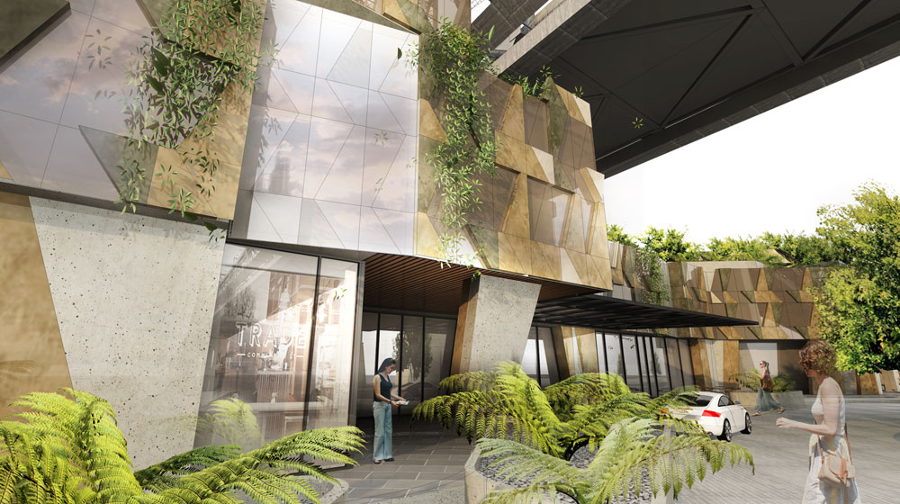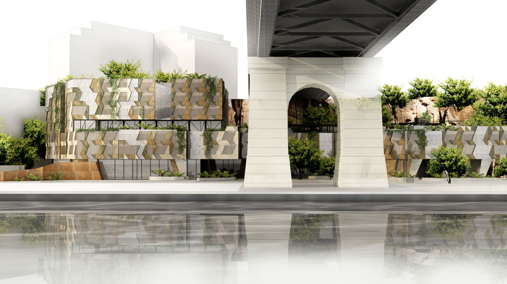 Designed by the multi-disciplinary practice SJB, the natural tones and textures of the hotel’s exterior will ensure it blends into the cliff face, its geometry referencing the fragmented cliff shapes and the bridge above. The lobby features a double-height wall of glass with a rugged outlook, while the guest rooms enjoy city views across the Brisbane River or of cascading greenery and the sculptured rock face.