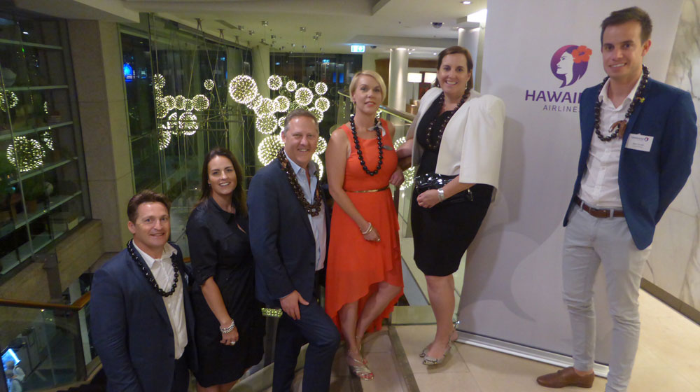 Lead image: Andrew Best, Hawaiian Airlines’ National Account Manager; Kate Cameron, Travel Partners; Jayson Westbury, AFTA; Karen Macmillan, Hawaiian Airlines’ Director of Sales for Australia and Partnerships Manager ANZ; Kaylene Shuttlewood, Travel Counsellors and Bart Druitt , Hawaiian Airlines’ Partnerships and Promotions Specialist. Also present, hidden behind the Hawaiian Airlines banner, Mike Thompson, Helloworld Travel.