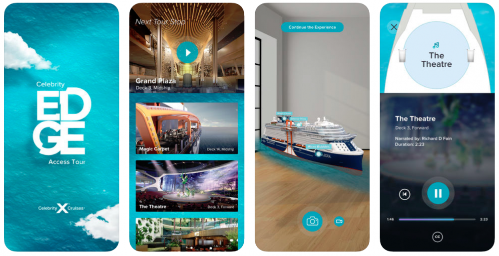 The augmented reality Celebrity Edge Access Tour app takes guests behind-the-scenes like never before. The tour uses binaural audio, soundscaping, and 3-D augmented reality technology to give guests the ultimate behind-the-scenes access to the story of this groundbreaking new ship.