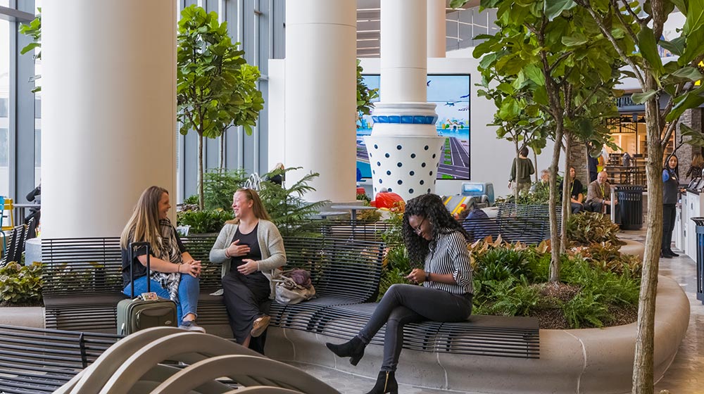 The play area is next to an indoor green space, modelled after New York City’s own parks, which includes benches and plenty of natural light for passengers to relax with their families before their flights.