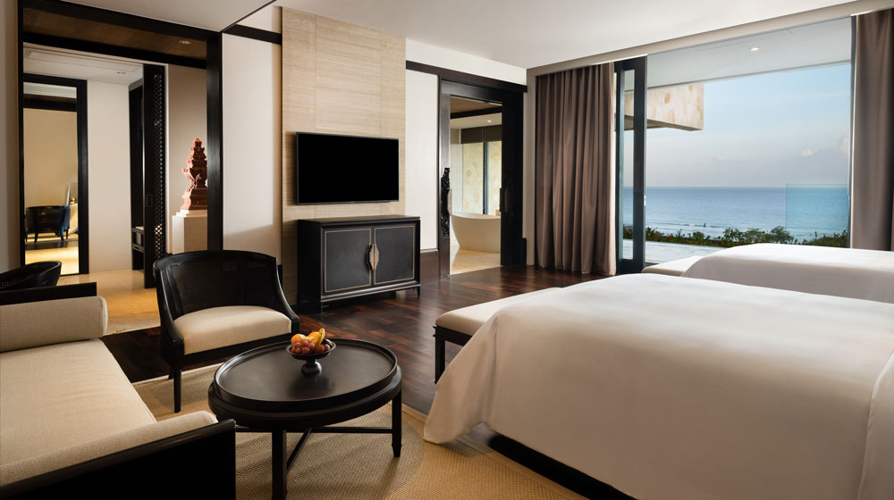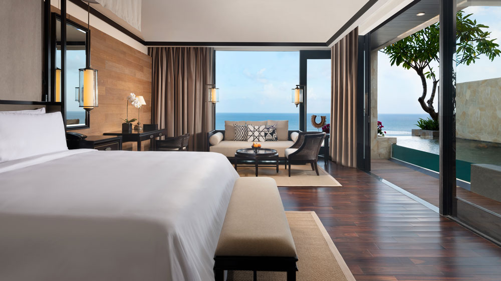 Spread across the resort, 162 exclusive clifftop and oceanfront Junior Suites and 14 Specialist Suites have private plunge pools, and guests benefit from access to the Cliff Lounge and its panoramic pools. The remaining 256 Grand Deluxe Rooms, ranging from 65–80 square metres, are beautifully appointed, featuring traditional Indonesian patterns and spectacular views.