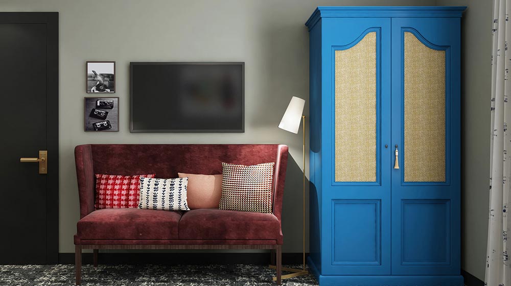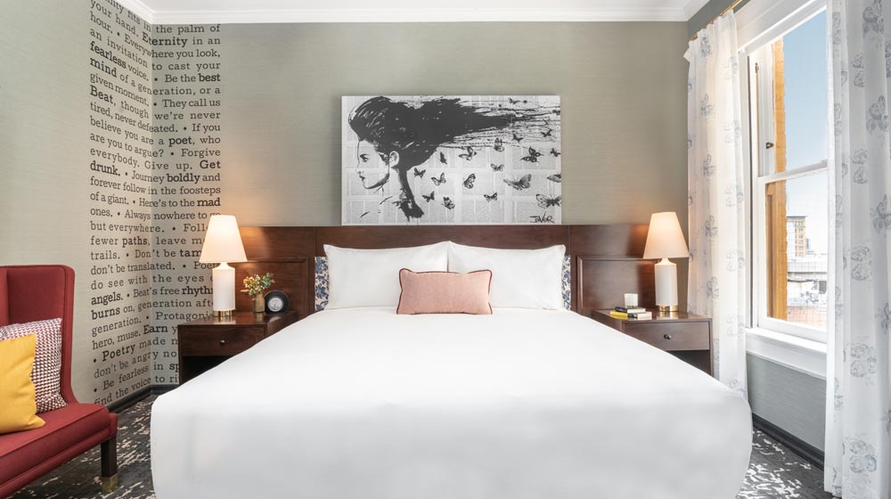 Rooms are eclectic havens of bold colour and playful patterns, and guests will be inspired by poetry references that pay homage to the themes and personas of the Beats. Designed by San Francisco-based Studio Hatch, the guestrooms accentuate the architectural bones of the historic building while featuring contemporary furnishings and a boho spirit. High ceilings and expansive windows invite relaxation. With modern art and European-inspired furniture, the feeling is residential and intimate.