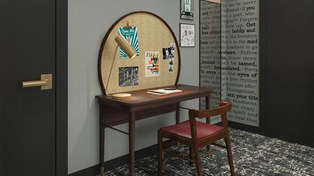 At each custom desk, a French bistro chair sits in front of an inspiration board that allows guests to interact with Beat references such as photo-booth strips and scribbled notes from celebrated writers. The bathrooms have big personality, too, with graphic tiled floors and black stone vanities complete with Natura Bisse and ROIL by Amanda George bath products.