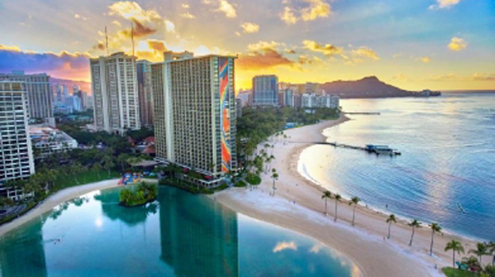 Hilton Hawaiian Village Waikiki Beach Resort: Located on nine lush, tropical hectares, Hilton Hawaiian Village fronts a wide stretch of white-sand beach and boasts swimming pools and water slides. A range of ocean activities includes surfing, snorkelling, catamaran and cruises. Enjoy 18 restaurants and lounges, free daily cultural activities, the Waikiki Starlight Luau and over 90 shops and services. The 2,860-room property is a premier meeting destination, with over 13,000 square metres of unique indoor and outdoor function space.