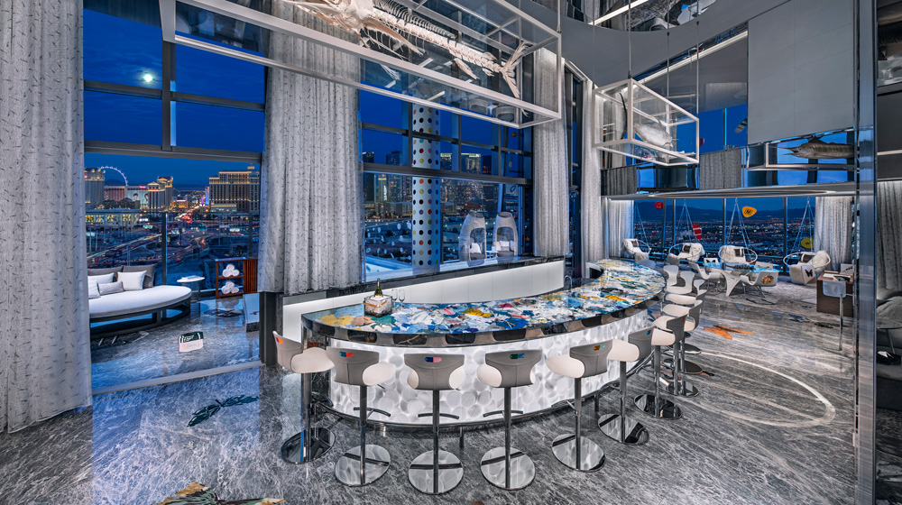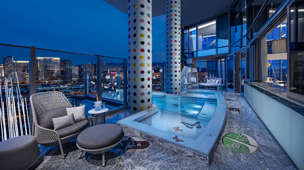Palms Casino Resort in Las Vegas has unveiled a US$100,000-a-night suite designed by and featuring the works of artist Damien Hirst. It is one of the world’s most expensive hotel accommodations (requiring a minimum two-night stay), and while available to the loaded traveller, it is also reserved exclusively for million-dollar casino players and is part of the casino’s US$690 million reimagination project.