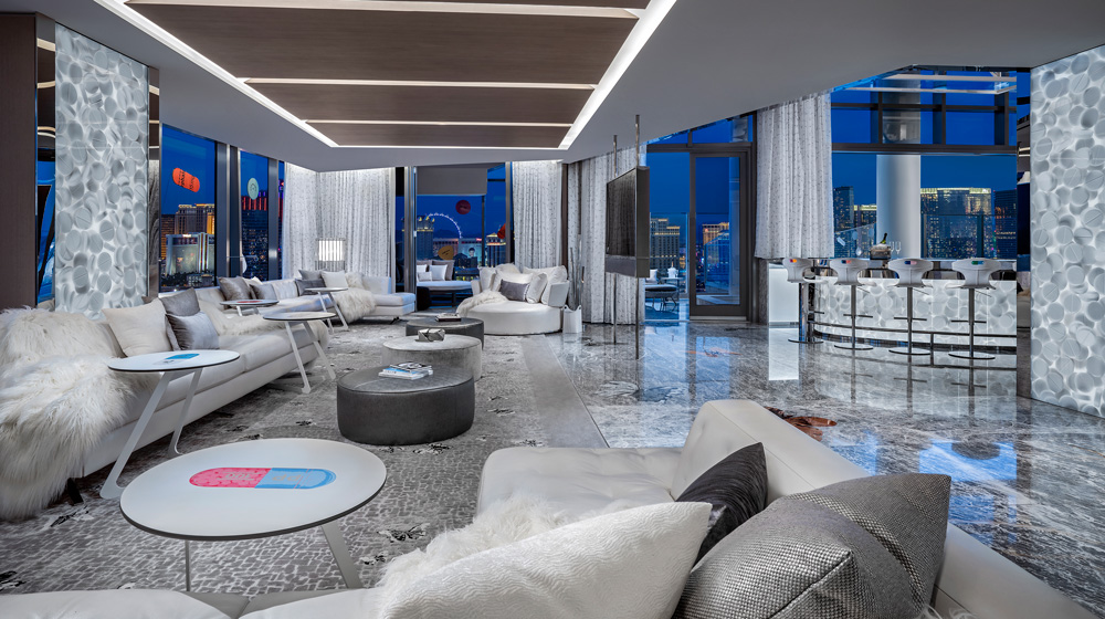 The Empathy Suite designed by Damien Hirst joins the hotel’s other five Sky Villas, all of which have been completely re-imagined from top to bottom by award-winning Bentel & Bentel Architects, making them some of the most luxurious (and expensive) hotel accommodations in the world, ranging from US$25,000 to US$50,000 a night.
