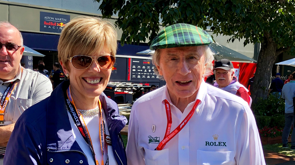 Wendy is pictured at the recent Australian Grand Prix in Melbourne with the legendary British Formula 1 champion Sir Jackie Stewart, aka the ‘Flying Scot’, who won the World Drivers’ Championship on three occasions between 1965 and 1973.