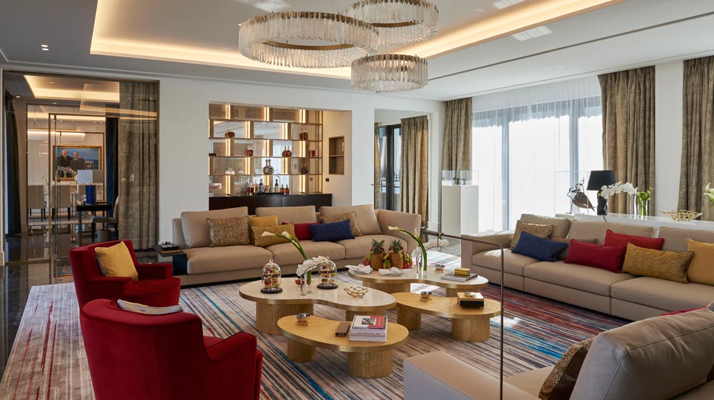 The suite’s interiors harmoniously combine the classical luxury of noble and precious materials with contemporary design, creating a space that is light and cosy with clean lines and a warm atmosphere. In terms of amenities, guests can experience their own steam shower and sauna, private bar in the lounge, office space and a superb 135-square-metre terrace with an infinity pool with wave system.
