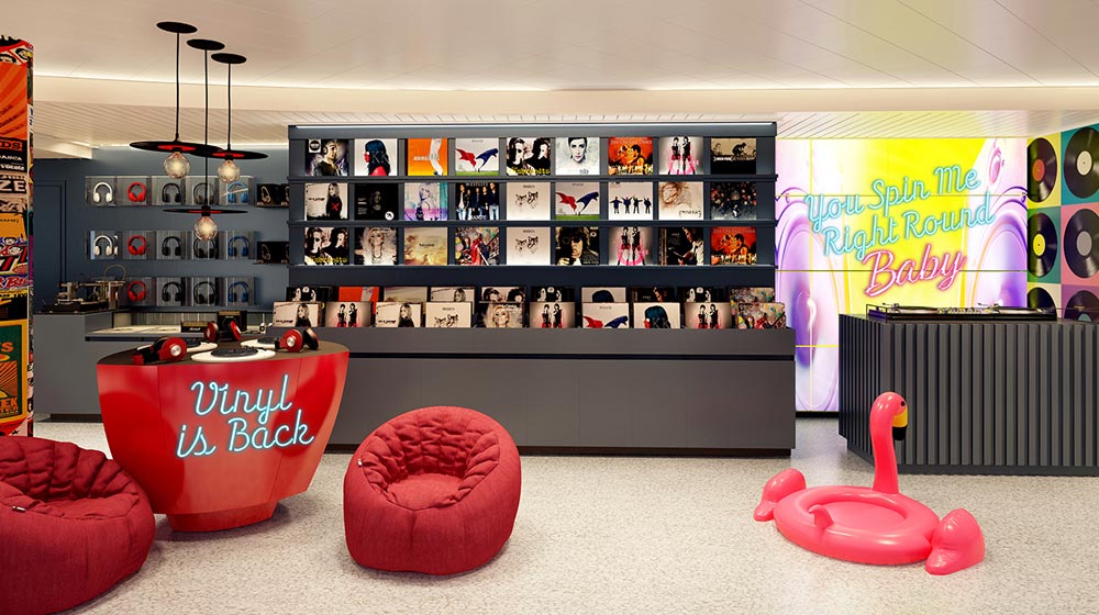 Leaning into Virgin’s history in music, something old is new again with Voyage Vinyl, the record shop aboard Scarlet Lady. Voyage Vinyl will be the go-to spot on board for Sailors to experience music from all eras and genres. Voyage Vinyl features personal listening stations for Sailors to enjoy their favourite albums both current and classic. Sailors looking for something unique can also shop for limited-edition curated albums and special editions of classics. Sailors can also purchase music magazines, headphones and record players.