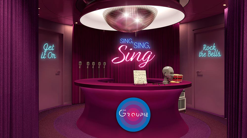Sailors can let loose at The Groupie, Virgin Voyages’ bookable karaoke, gaming and movie lounge. Designed by Roman Coppola, The Groupie was designed as a modernist take on a Japanese-style karaoke room for Sailors to enjoy singing along to their favourite tunes with friends.