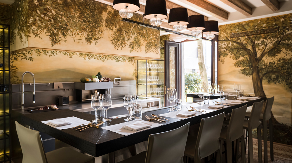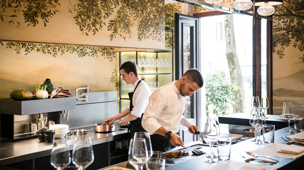 Seating just ten diners, the Palazzo Kitchen Table is an exquisite, light-filled space just a lawn away from the Grand Canal. At its heart is a state of the art Marrone + Mesubim integrated kitchen, and the only Teppan – a Japanese grill for cooking Teppanyaki style – in Venice. Delicately decorated by the painter Matteo Bertelli with leaf motifs, it invites the garden – a rare feature in Venice – within, while also boasting its own wine cellar. This houses an impressive wine collection including rare vintages from Bordeaux, Burgundy and Champagne in France, and a 1995 merlot from Tuscany in Italy.