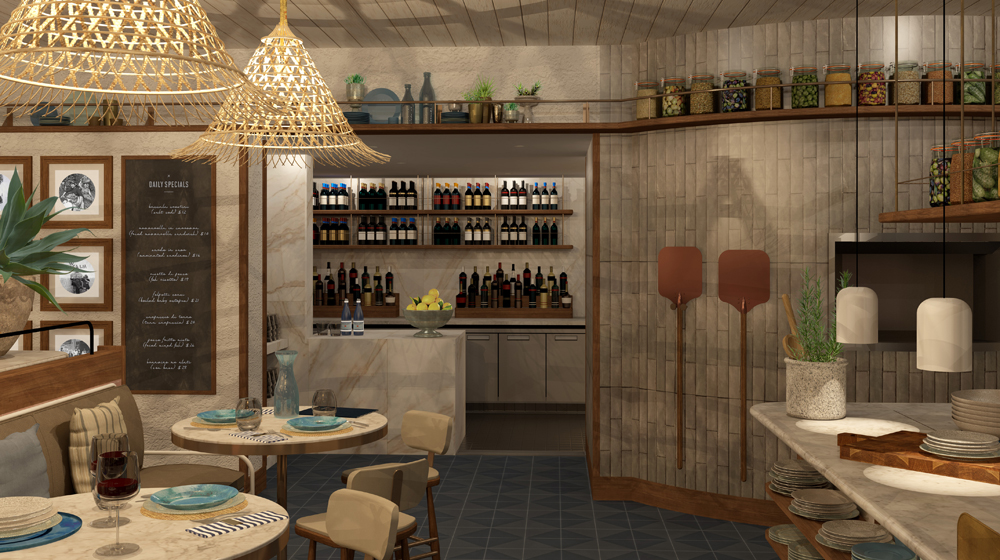 AQUA rendering - Amici Trattoria – A blazing wood-fired pizza oven sits at the heart of this casual Italian eatery. The menu features pizza, pasta and an Australian wine list starring Italian grape varietals.