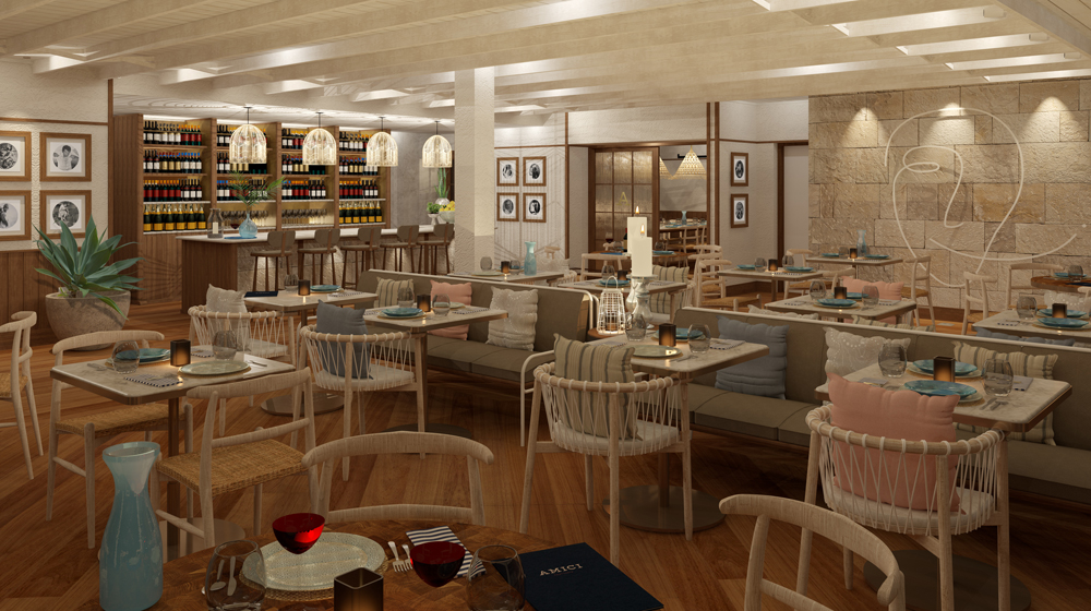 AQUA rendering - Amici Trattoria – A blazing wood-fired pizza oven sits at the heart of this casual Italian eatery. The menu features pizza, pasta and an Australian wine list starring Italian grape varietals.