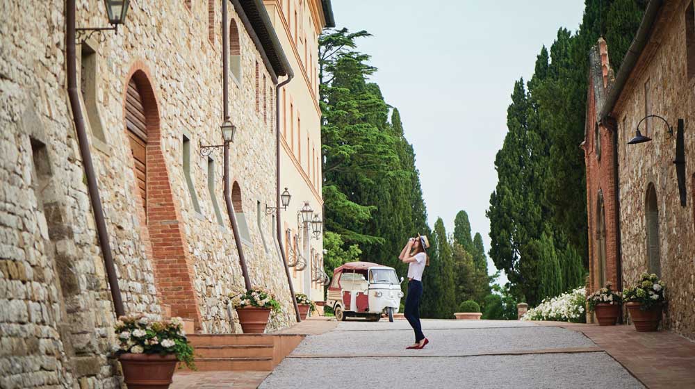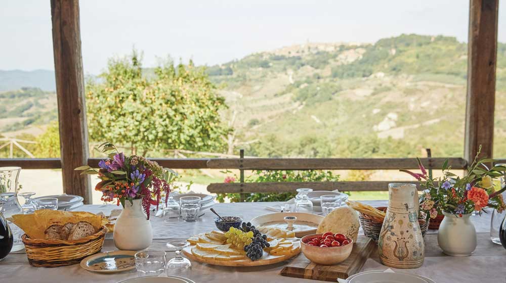 My suite was down a short pebbled street from the central three-floor ‘mansion’ in CP33 (Casa del Prete). Up 13 smooth-brick steps from the ‘street’, my home looked out onto the Tuscan landscape. I was reminded of the past and, at the same time, I had the trappings of today, including an espresso maker, electric towel rail and good WiFi. I also loved the addition of a satin pincushion with threaded needles and a box of goodies with postcards showing Maria Callas with Visconti, whose brother owned the estate. An enticing booklet suggested a range of activities, from boar hunting through to ballooning, but sadly my time was limited (next time the Essere Spa is definitely on the list). I hiked briskly down the near-diagonal approach road and watched world news on a Technogym elliptical (how nice to have a gym with a view, especially over Tuscan valleys).