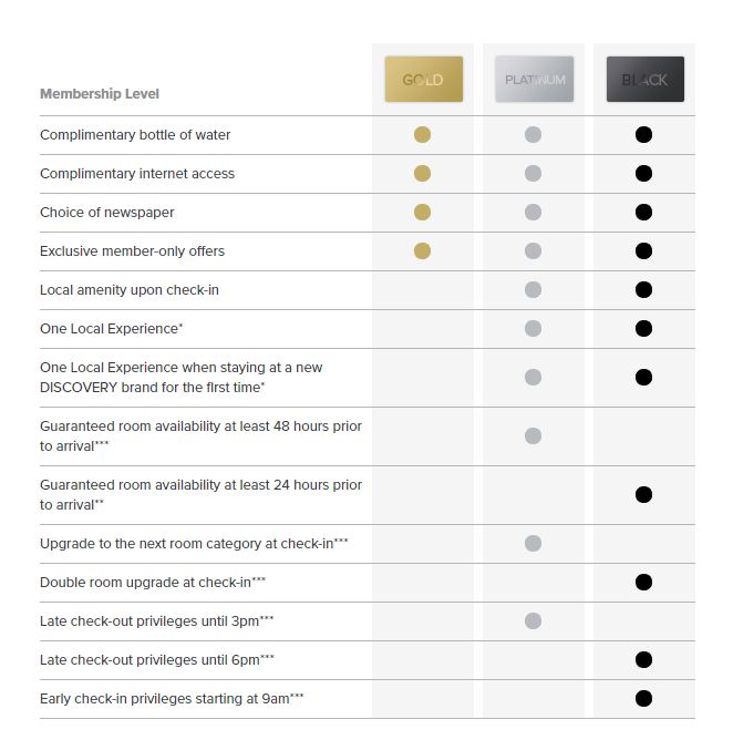 There are three membership levels for DISCOVERY – Gold, Platinum and Black – and each qualifying stay counts equally towards elite qualification.